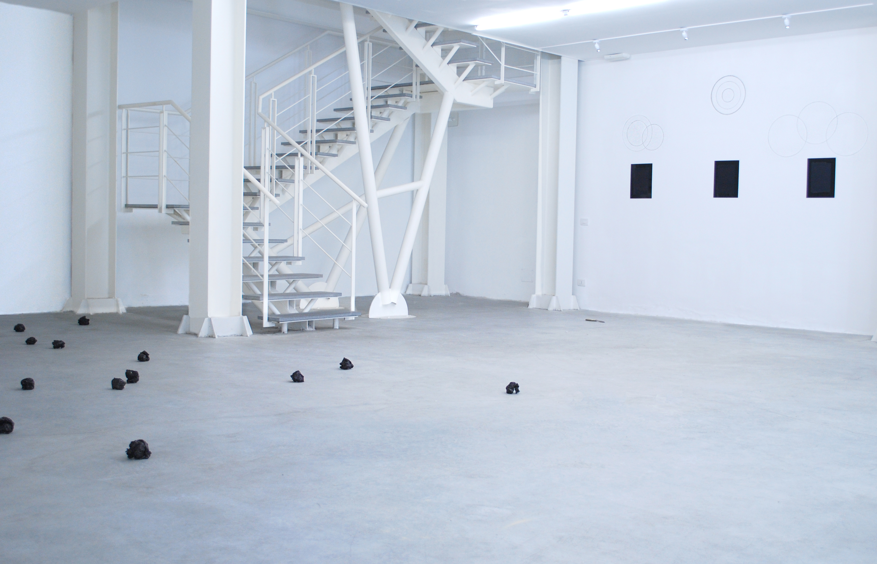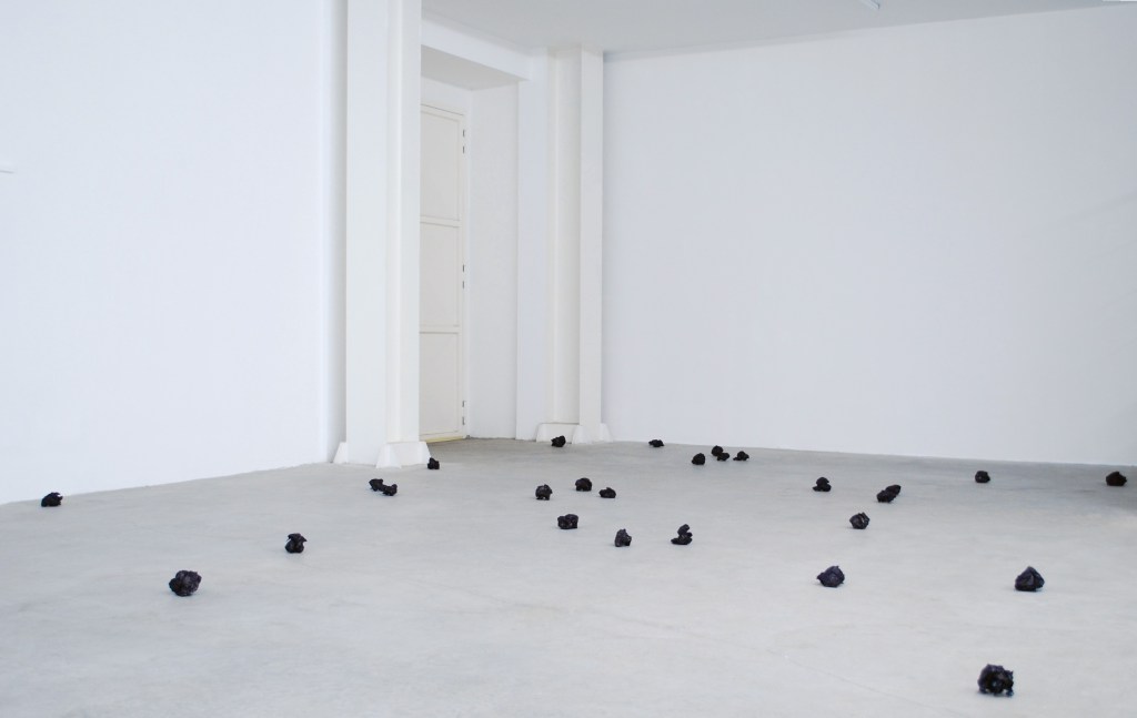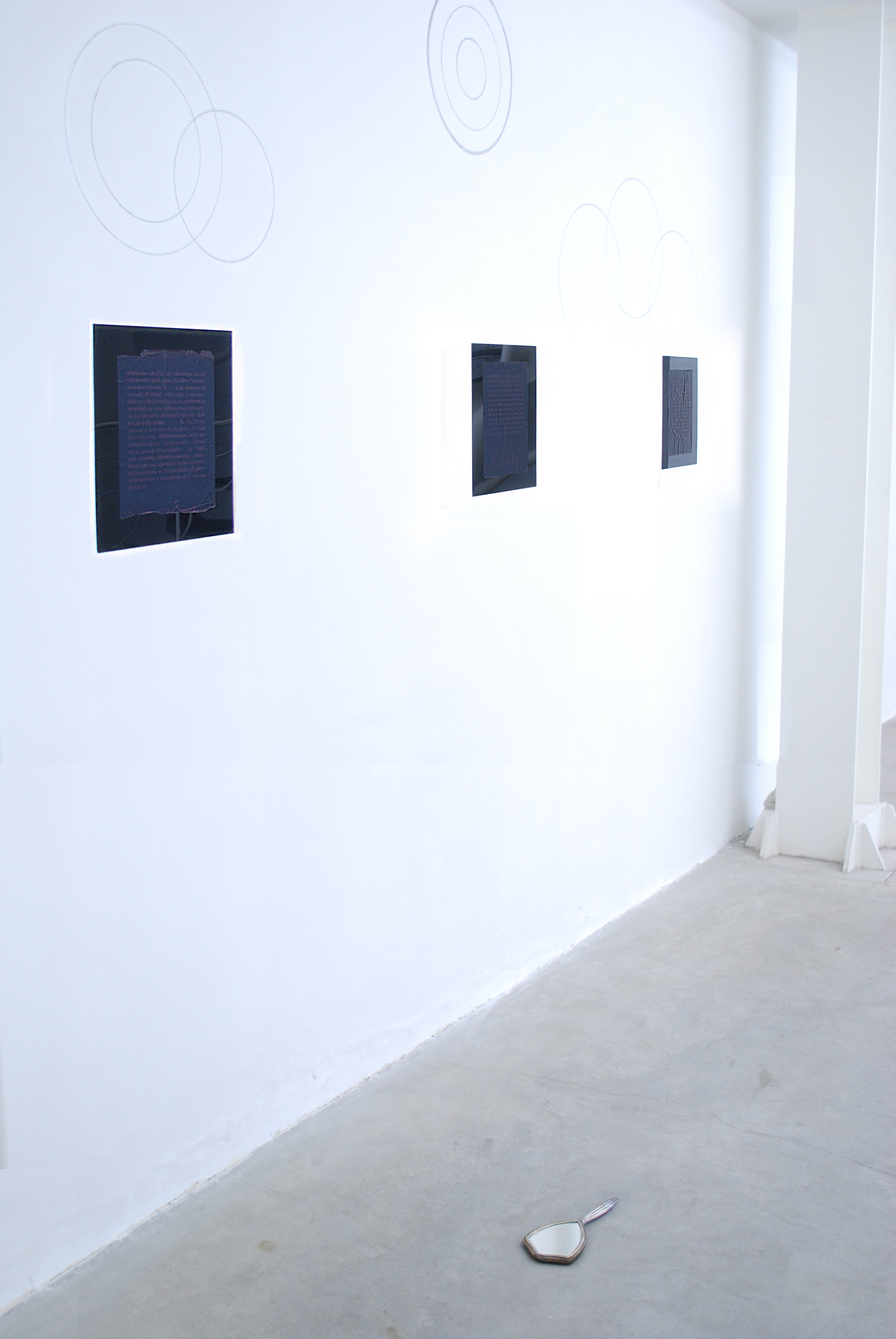 Three texts written on carbon paper, explain the meaning of three words: silence, complicity and memory. These words are legible on the reverse side of the papers by using a mirror. A diagram drawing on the wall outlines the representation of different elements contained inside a closed line. The diagram shows the graphic dynamic of the syllogism whose summary is “silence is not complicit in memory.”