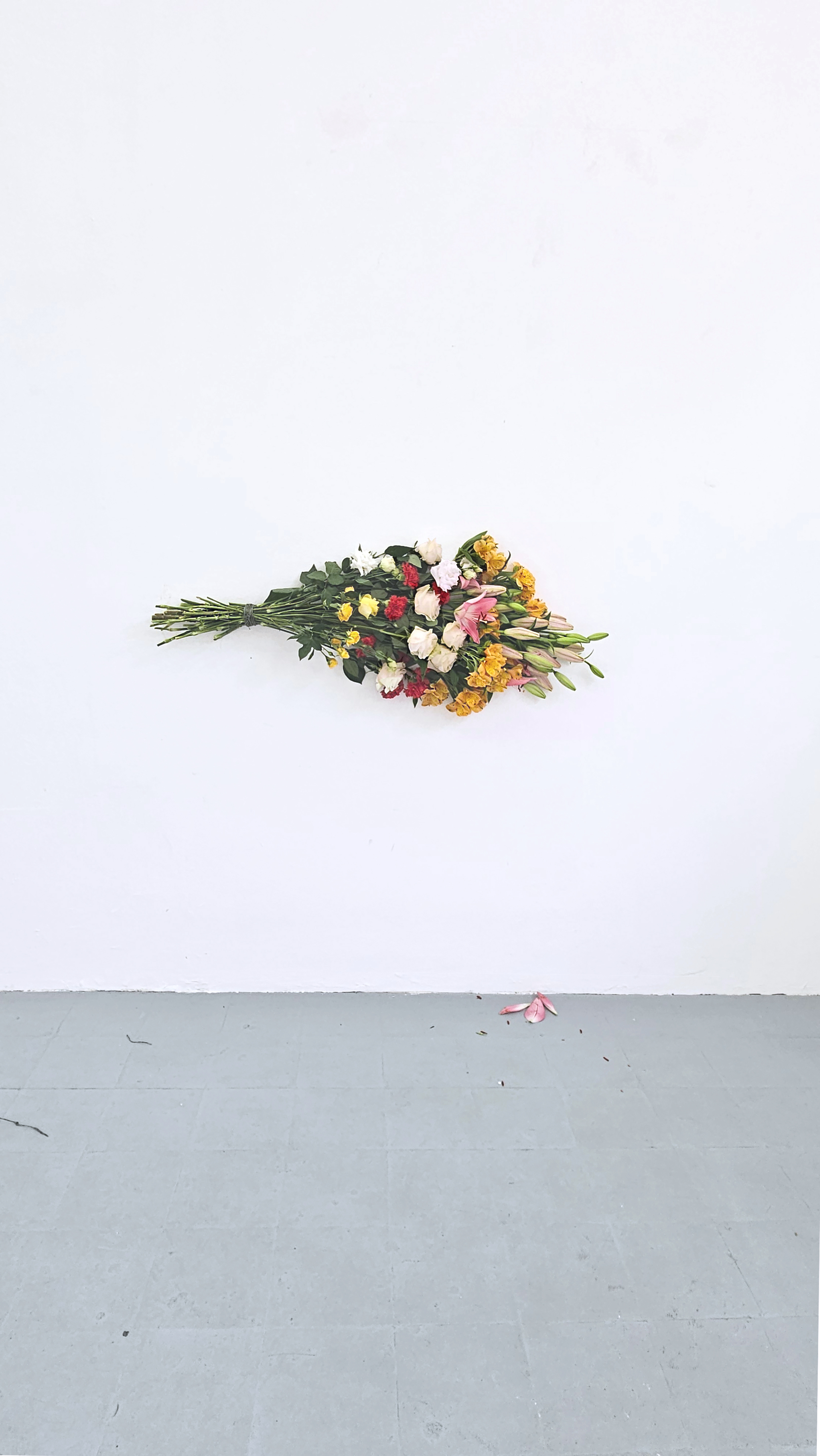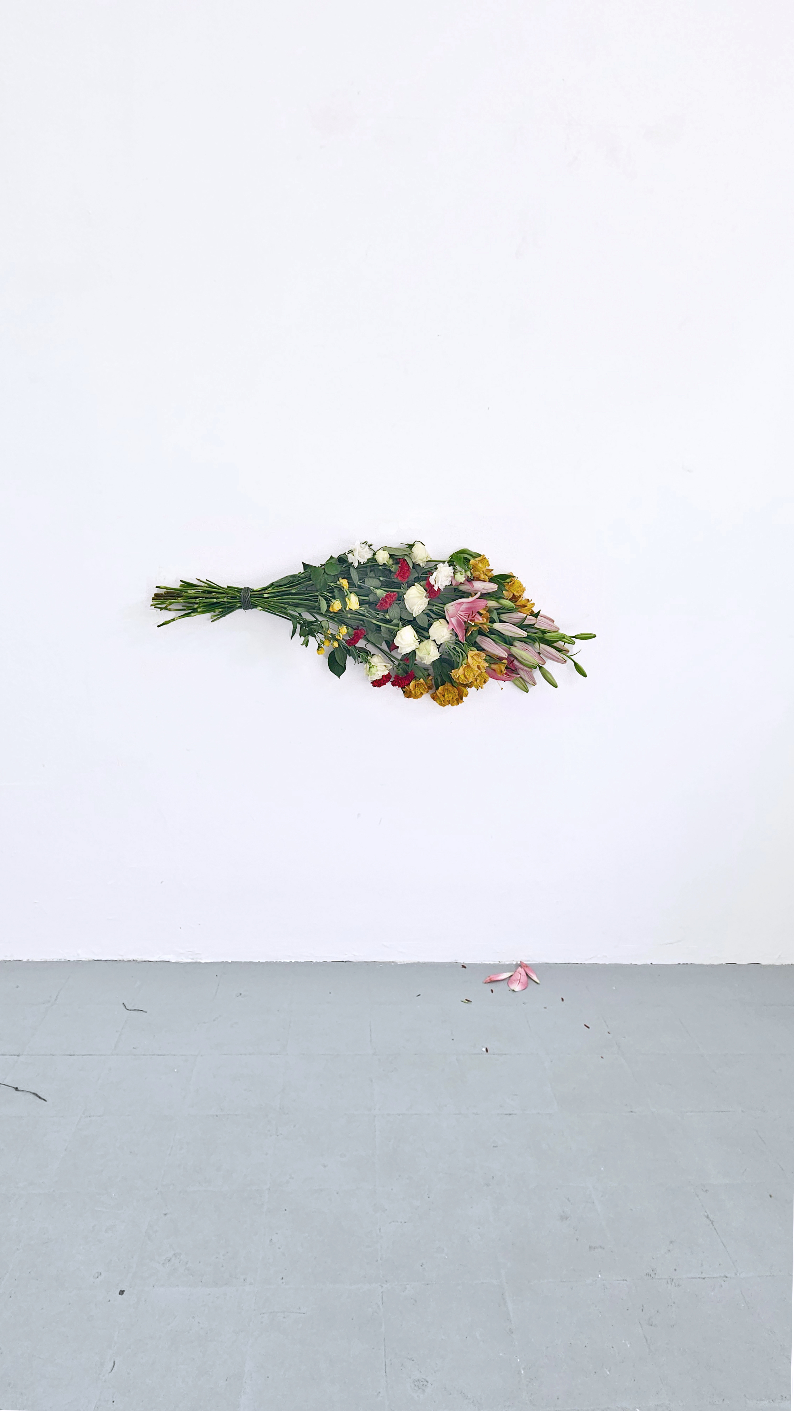 On Your Behalf is a site-responsive installation composed of fresh flowers installed directly on the wall. The work allows the material to guide its form. Because the flowers begin to wilt, shift, and decay from the moment they are placed, the artwork exists in a state of continual transformation revealing a condition of transition and impermanence. The work stands in for gestures, words, or presences that arrive belatedly or disappear too soon. Their slow transformation becomes visible as the shifting conditions of connection, memory, and loss unfold, as they dry, fall, and change.